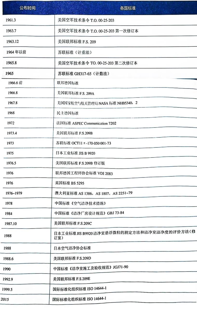 1999年国际标准化组织ISO技术委员会TC209“洁净室及相关受控环境”制订的ISO 14644-1《洁净室和相关受控环境第 一部分:根据粒子浓度划分空气洁净度等级》标准是世界各国制订洁净室相关标准的基石,后于2015年进行了修订。后续各国陆续制订了自己国家的洁净室相关标准。