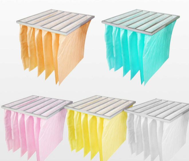 (3)袋式中效空气过滤器用途:中央空调集中通风系统,或作为高效过滤器的前置过滤器,它可以减轻高效过滤器的负担,延长其使用寿命,也可用于工业领域的一般空气净化。特点:阻力小、容尘量大。